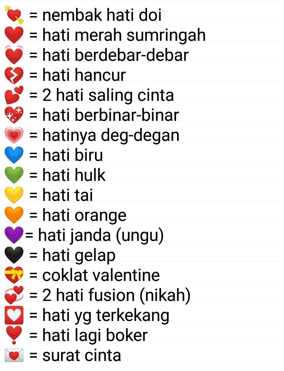 Ini makna sebenar warna-warni emoji hati yang ramai tak tahu. Maksud Emoji Love. Tak masalah mengirimkan emoji ini kepada pasangan di awal-awal menjalin hubungan.